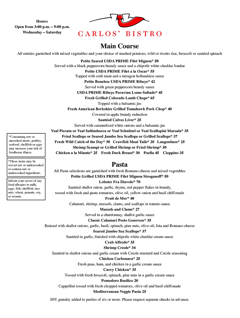 Carlos' Bistro is renowned for our exceptional customer service and tantalizing menu.